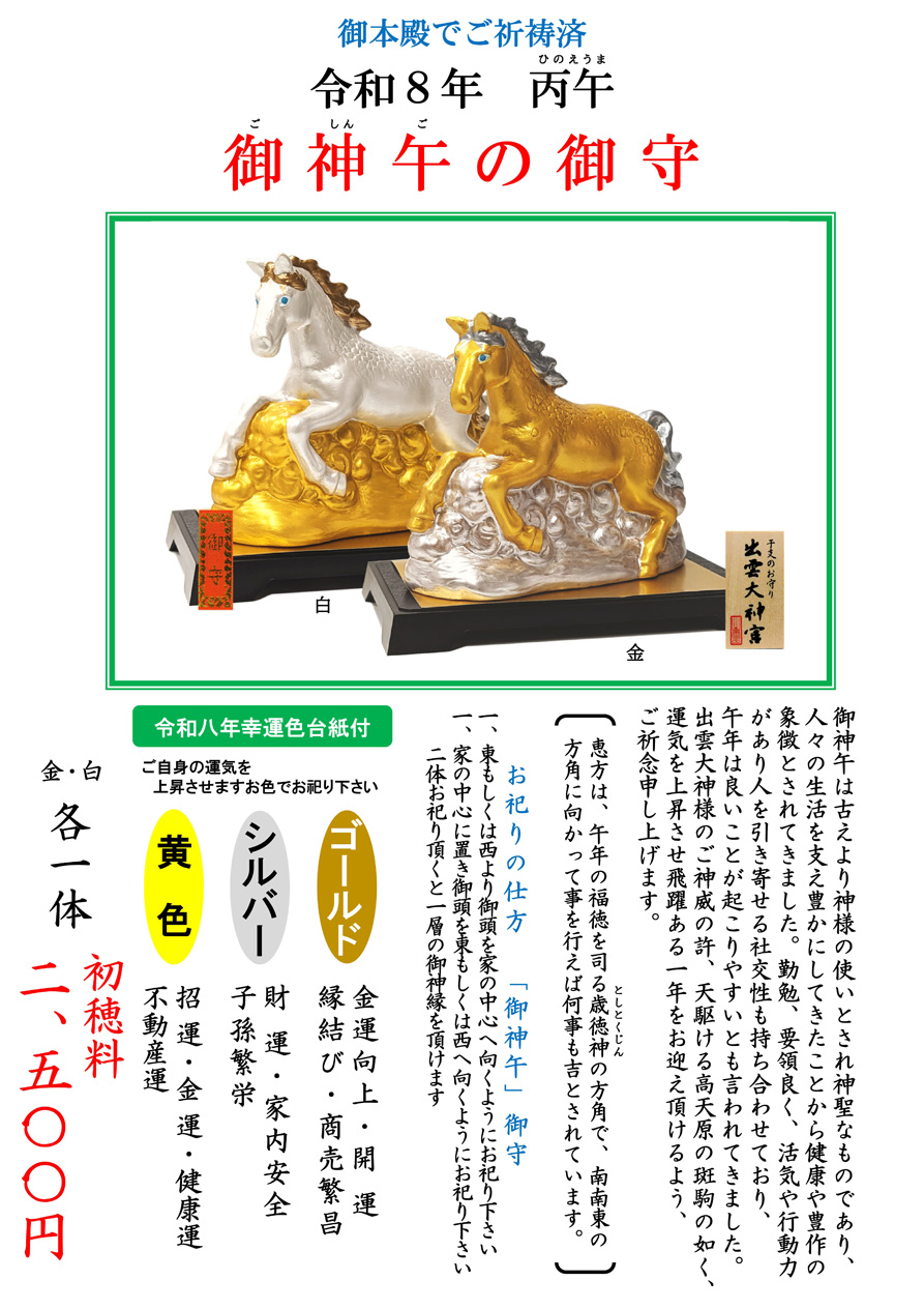 初穂料 御神午1体につき2,500円をお納め頂いております。